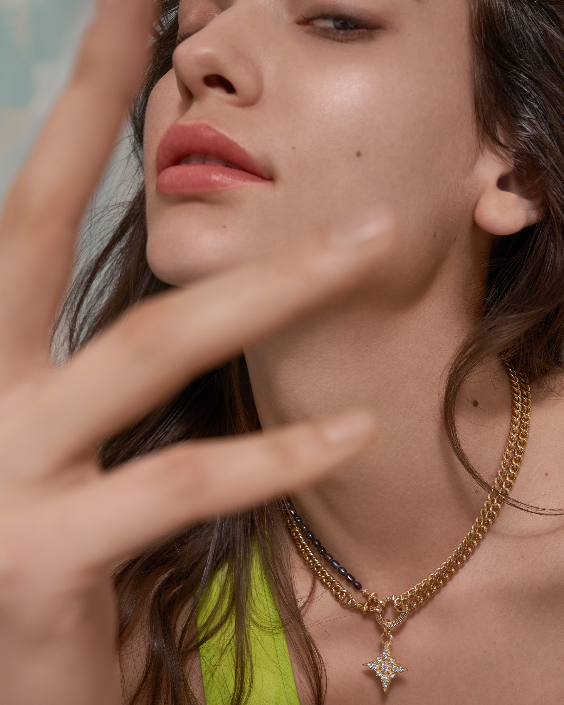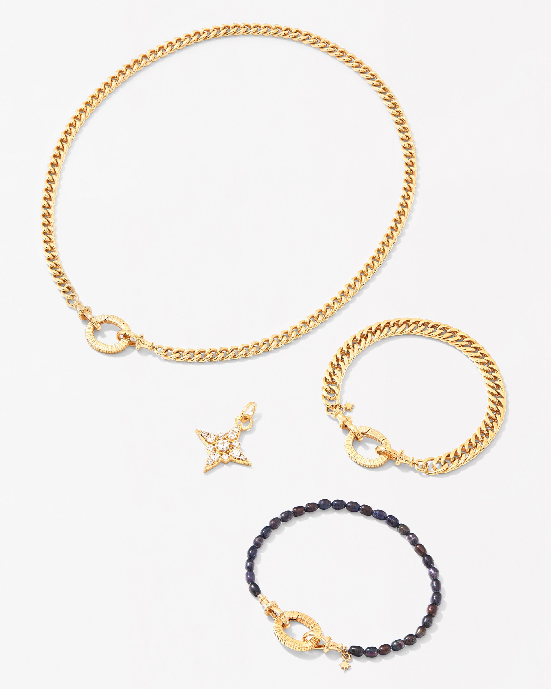 The ultimate jewellery combination: the DAWN chain necklace, DUSK chain bracelet, the new black pearl edition of our bestselling AERIN bracelet and the STELLA pendant. Wear the necklaces and bracelet alone, or link them together for a multi-layered effect. With its intricate antique-inspired design, the STELLA pendant can be added to the necklaces or the bracelet for added detail. How you choose to style your Multiway collection is up to you.