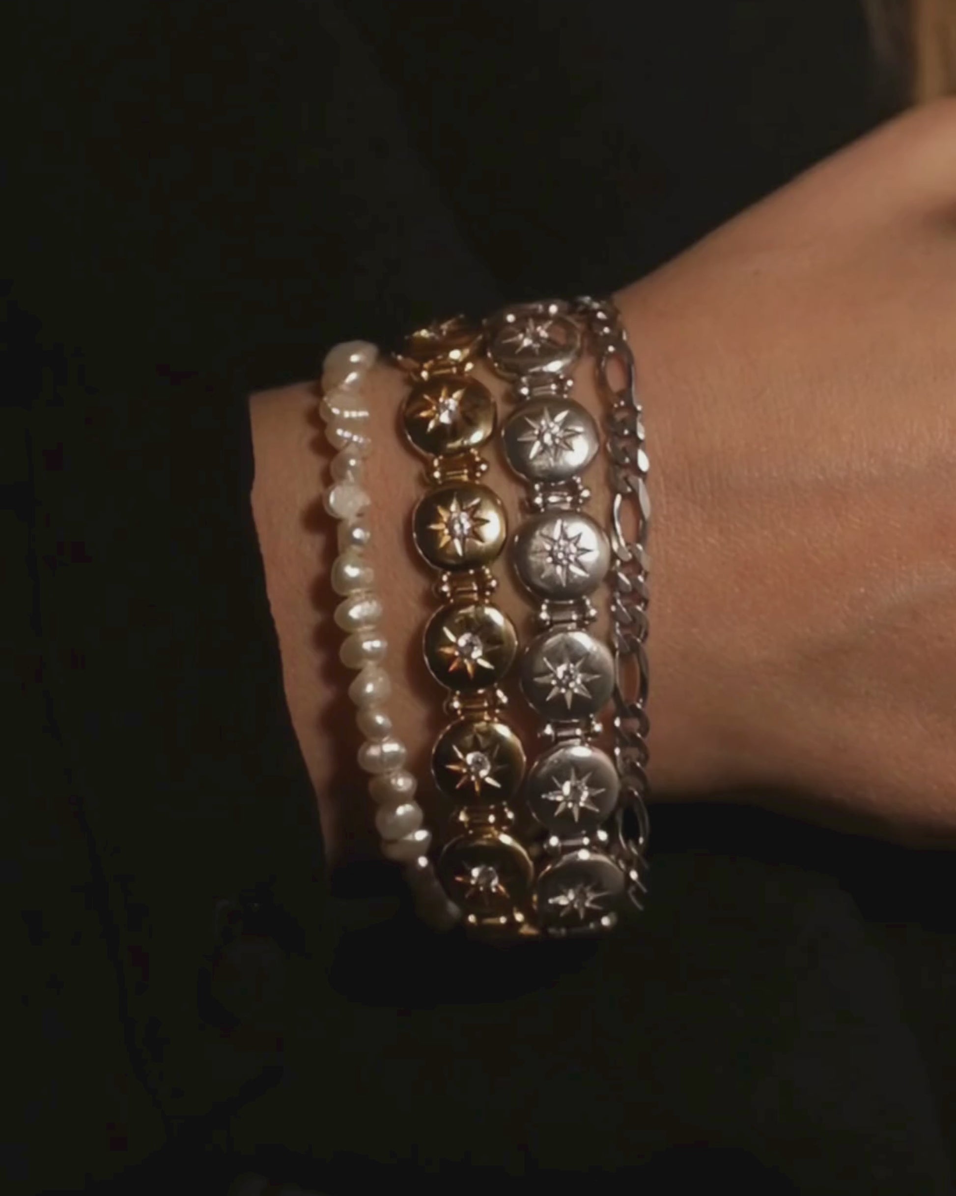 The bracelet you'll reach for every day. Inspired by vintage buttons, each disc on our ALBA bracelet features a tiny North Star detail set with a clear stone. An antique-style design that feels luxurious and tactile on your wrist.