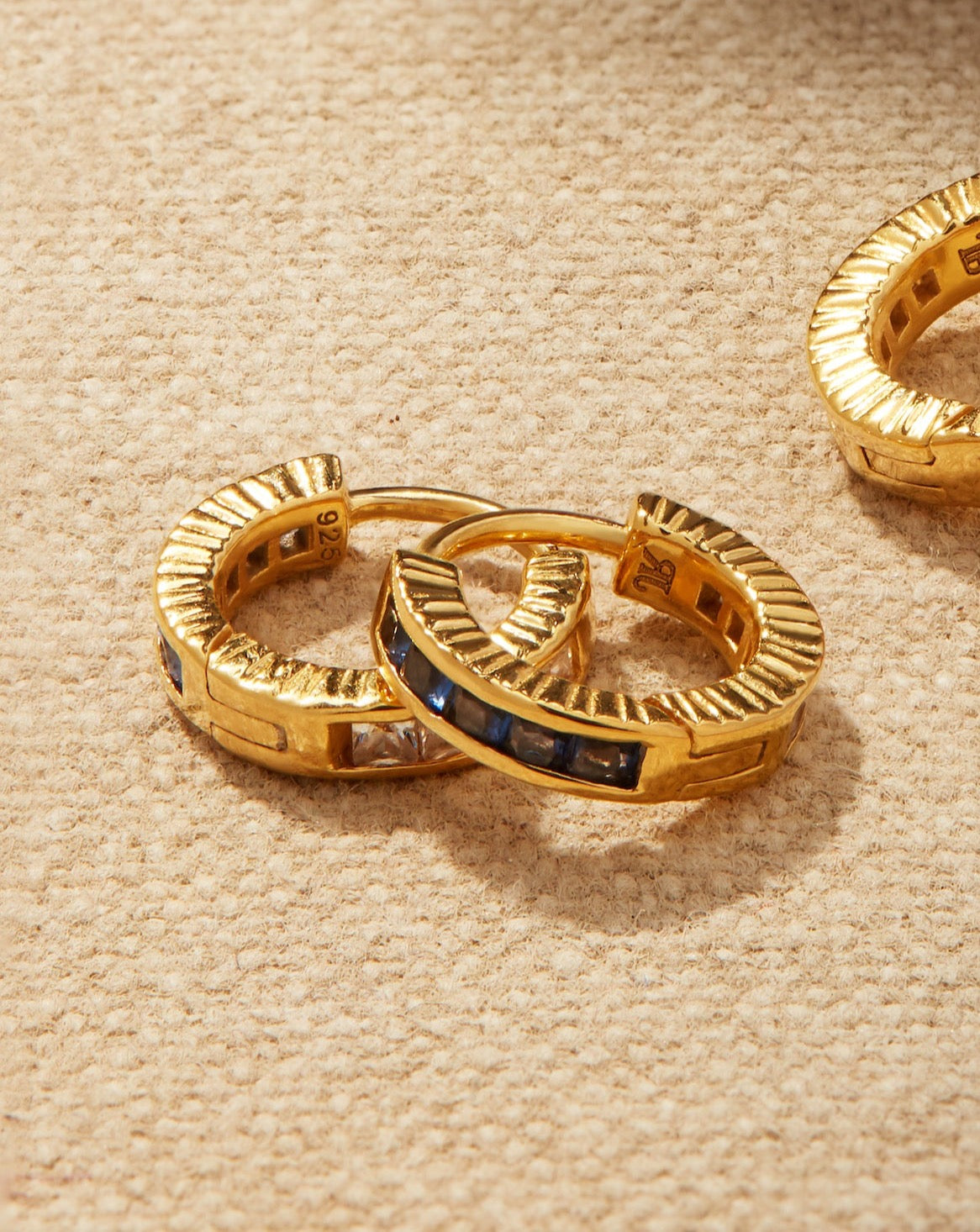 A new colour way of our bestselling ARIA earrings, perfect for summer. Sapphire crystals on one side, white on the other, these gold vermeil huggies are multiple pairs of earrings in one: simply reverse them to switch up your look, or add our earring charms if desired (though please take note of dimensions to ensure you choose the correct size for you).