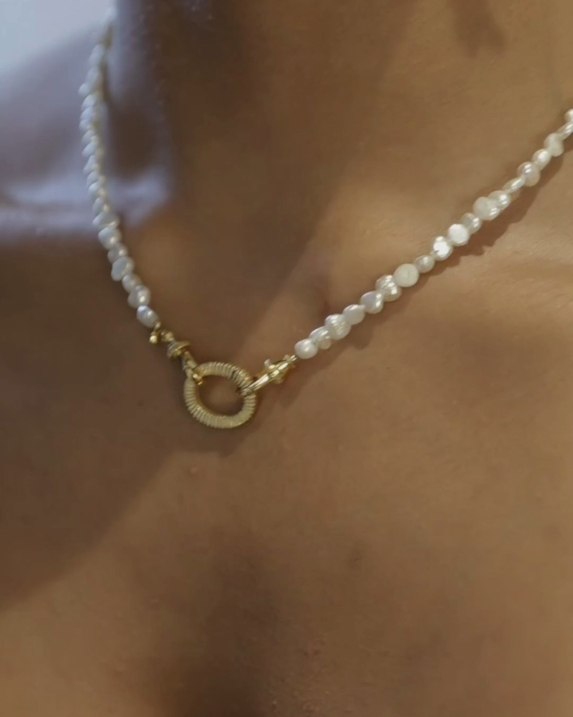 Our AURA Baroque Pearl Necklace features a single strand of cultured baroque pearls, finished with antique-inspired lobster clasps and our signature oval clasp. The connecting oval ring can be worn as focal point, used to add one of our pendants, or removed completely for a slightly smaller fit and more subtle look.