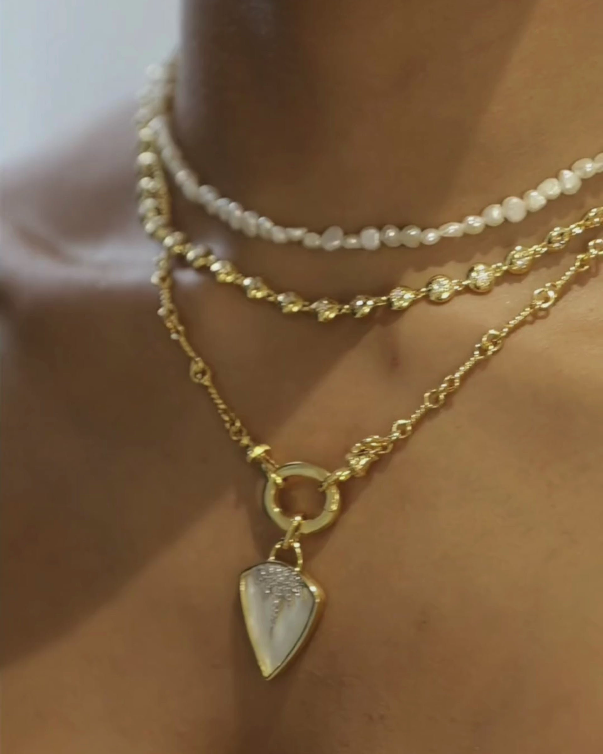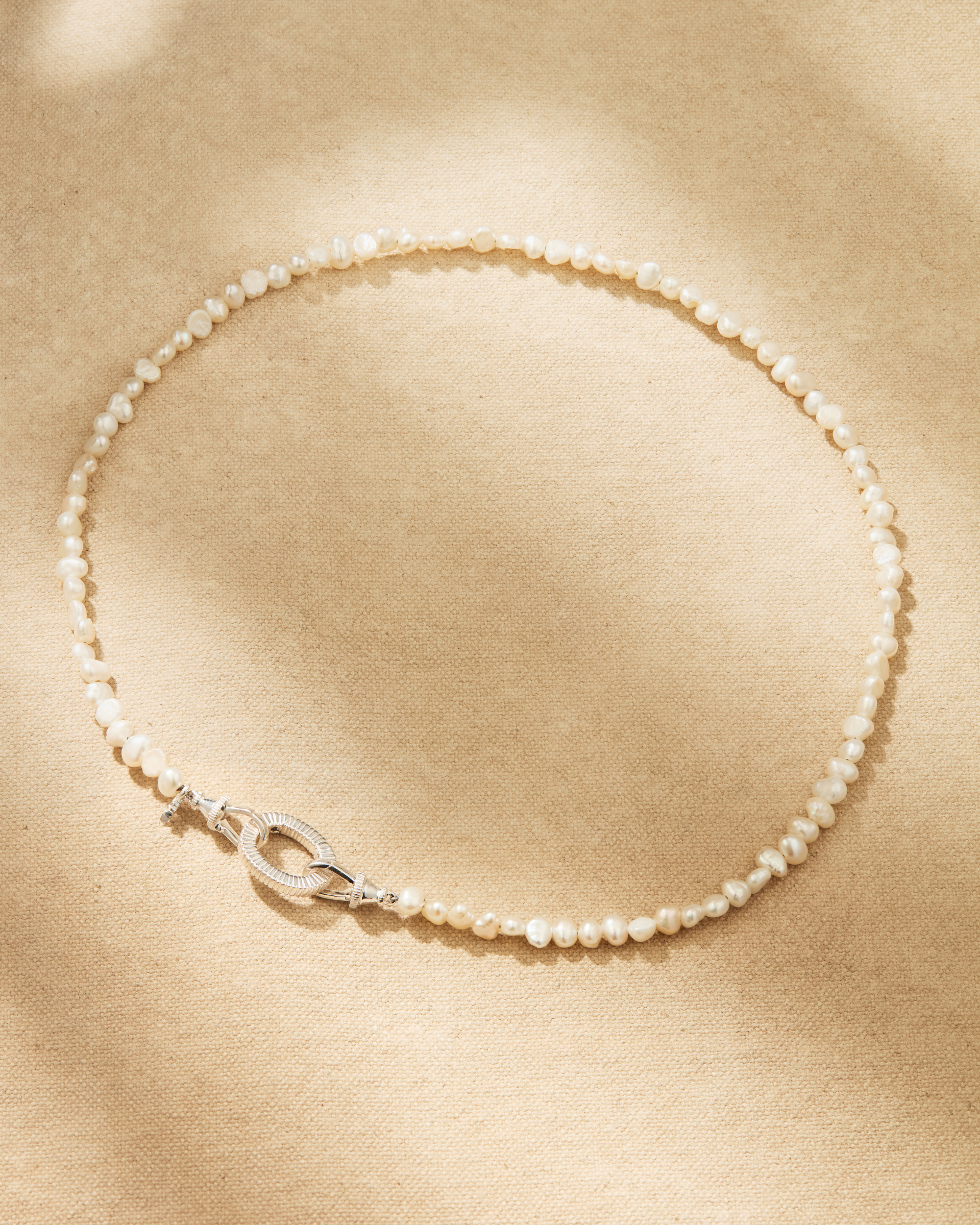 Our AURA baroque pearl necklace in silver features a single strand of cultured baroque pearls, finished with silver antique-inspired lobster clasps and our signature oval clasp. The connecting oval ring can be worn as focal point, used to add one of our pendants, or removed completely for a slightly smaller fit and more subtle look.