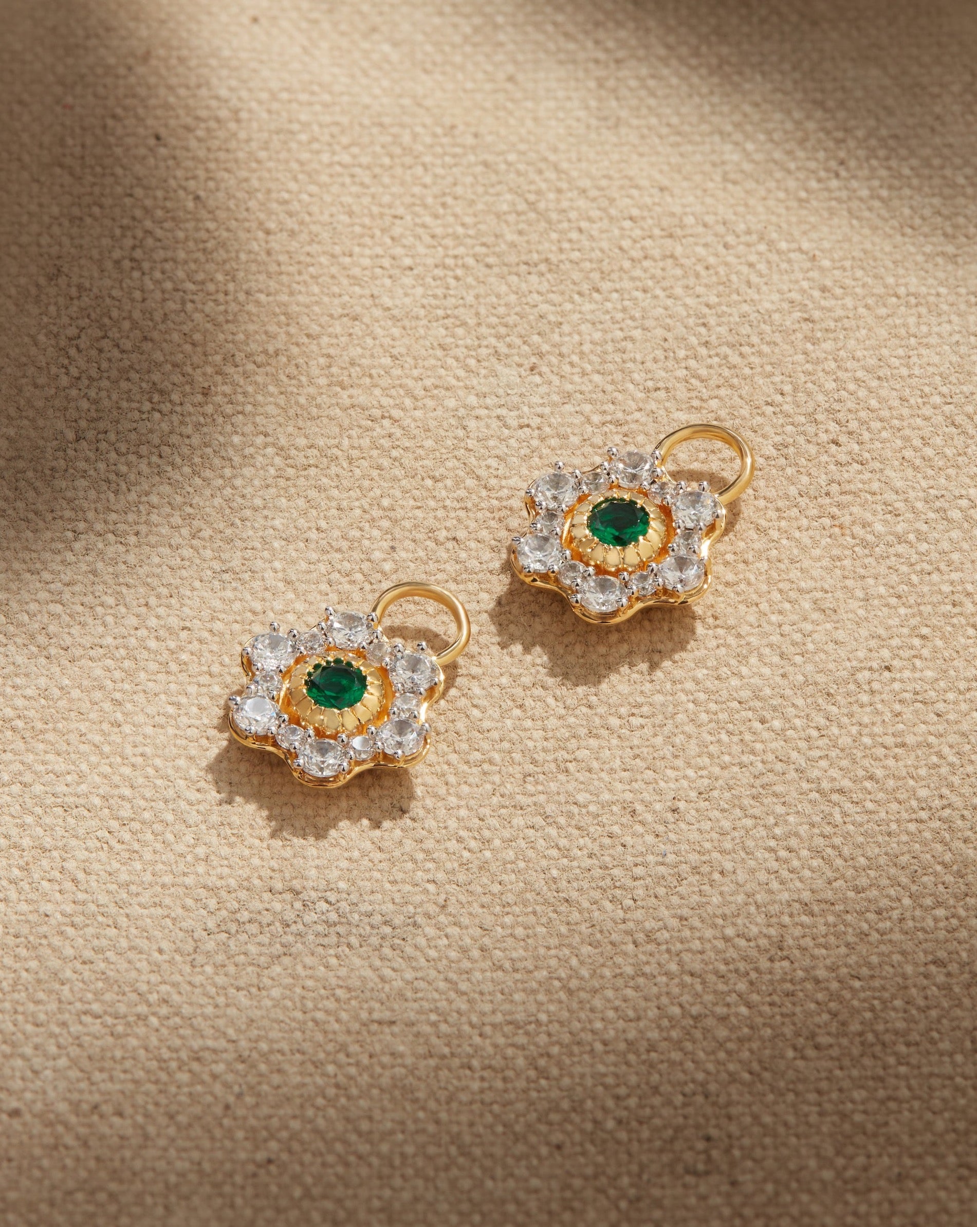 18ct recycled gold plating on brass with round brilliant cut white and emerald green crystals.