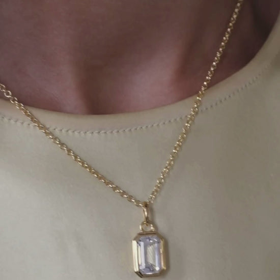 Recycled 18ct gold-plated brass pendant set with an emerald-cut Clear Quartz gemstone