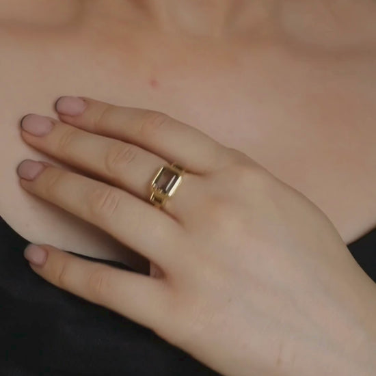 The emerald-cut stone sits elegantly on the hand, framed in a vintage-inspired bezel setting with delicate Smoky Quartz baguette accents on the shoulders. Wear it stacked with simpler bands or alone to let the gemstone take centre stage.