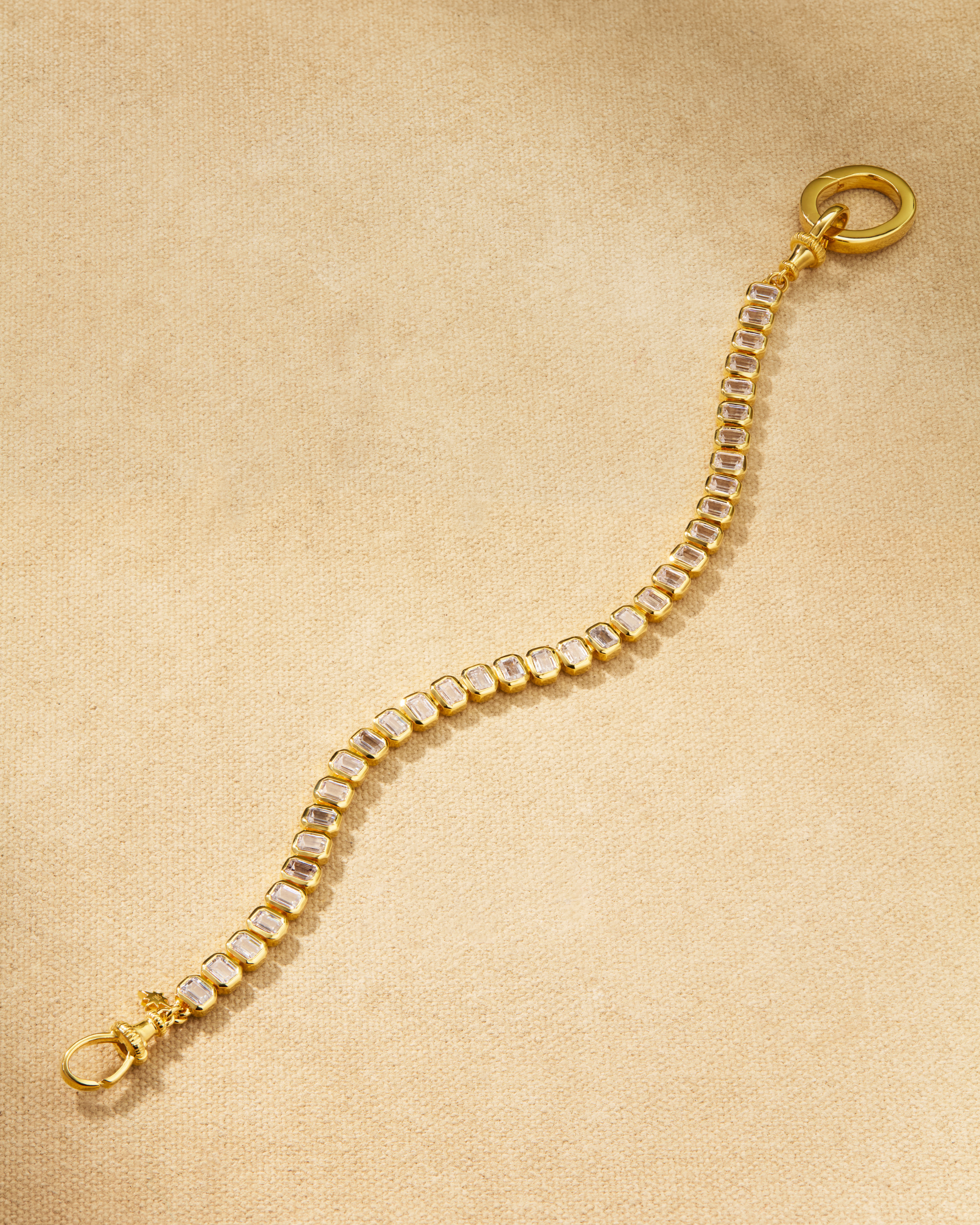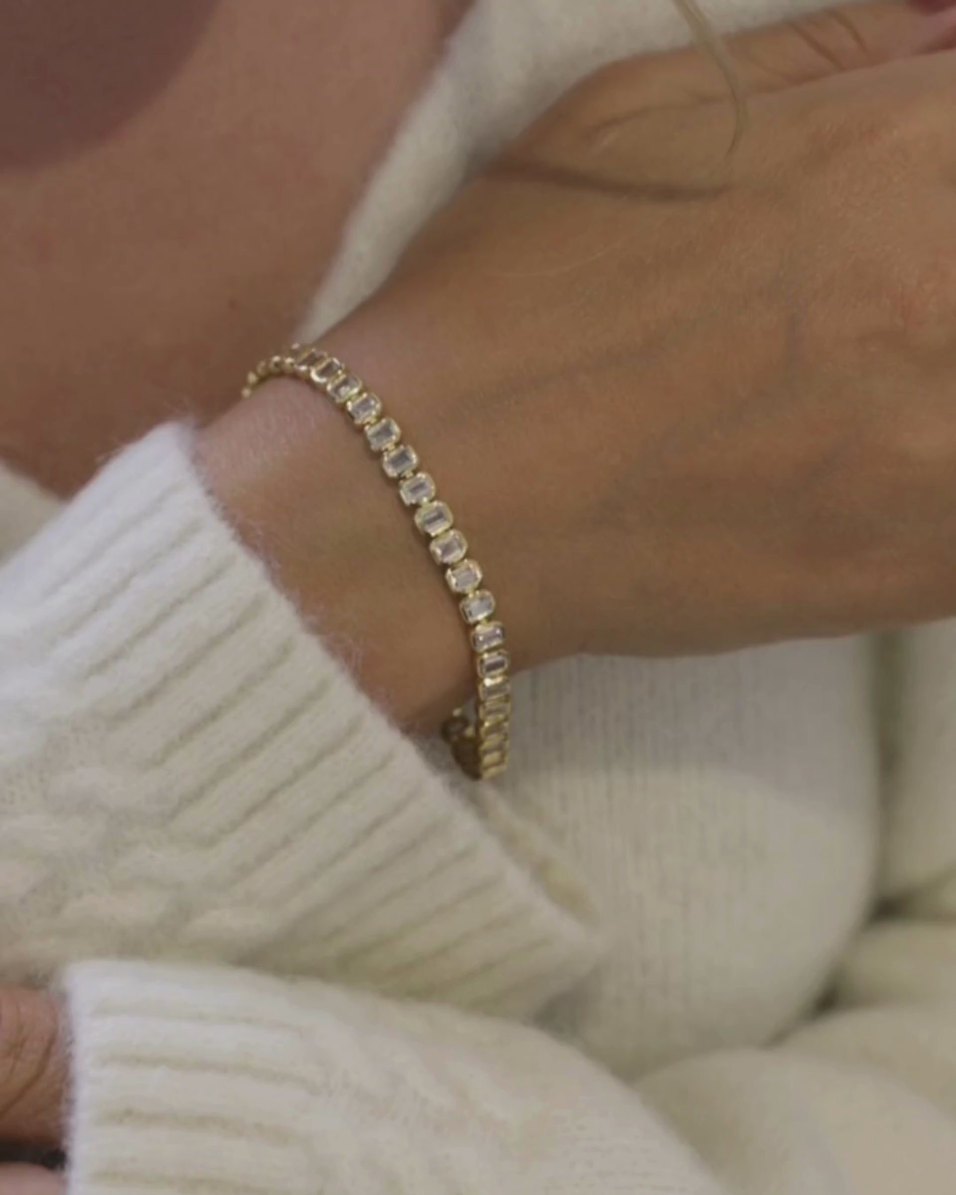 The must have piece of the season, Our ETTA emerald cut tennis bracelet is perfect to wear alone or to layer. Featuring emerald cut stones, each set in a smooth gold bezel setting, ETTA is a timeless piece that also includes our signature oval clasp, allowing you to style it multiple ways. Simply attach our other multiway bracelets to form a double chain, or to wear as part of a statement necklace. You can also pair our ETTA bracelet with one of our multiway pendants for a bolder look.