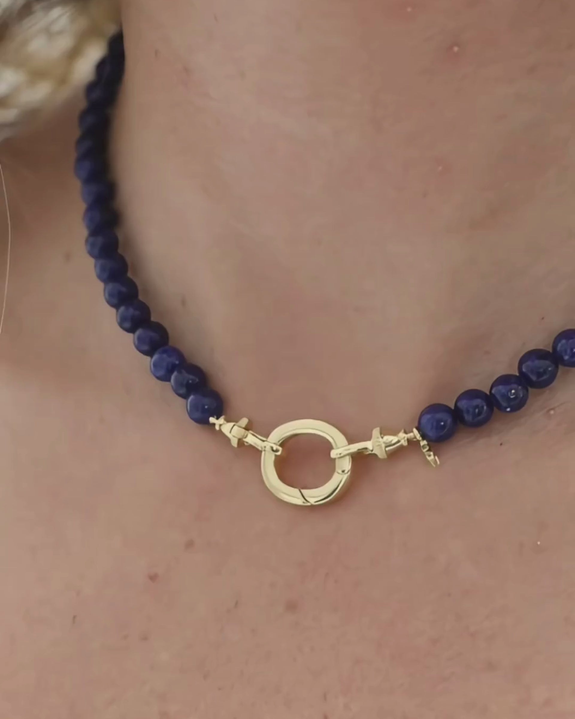 Our INDIGO Gemstone Beaded Necklace features a single strand of Lapis gemstone beads, finished with antique-inspired lobster clasps and our signature oval clasp. The connecting oval ring can be worn as focal point, used to add one of our pendants, or removed completely for a slightly smaller fit and more subtle look.