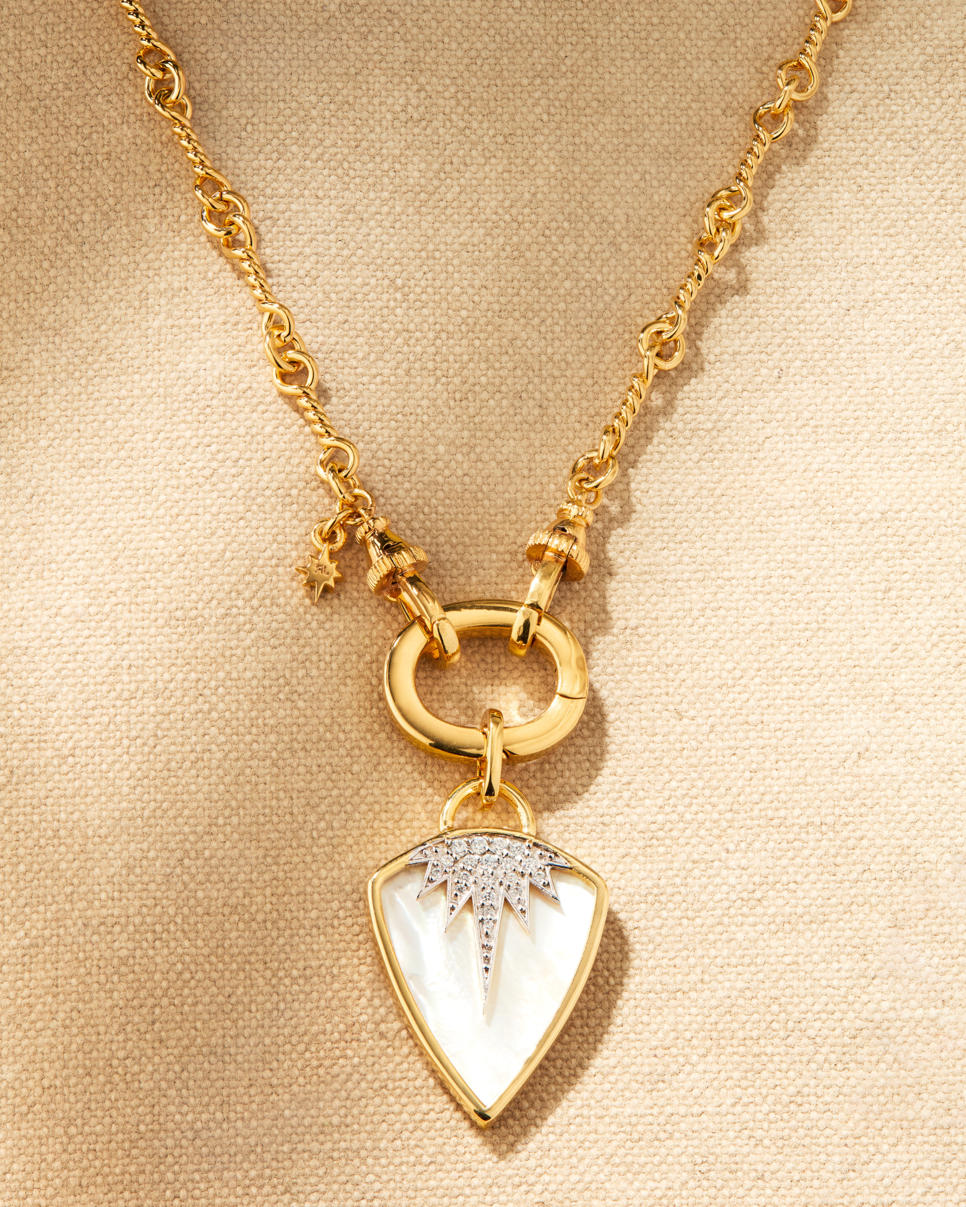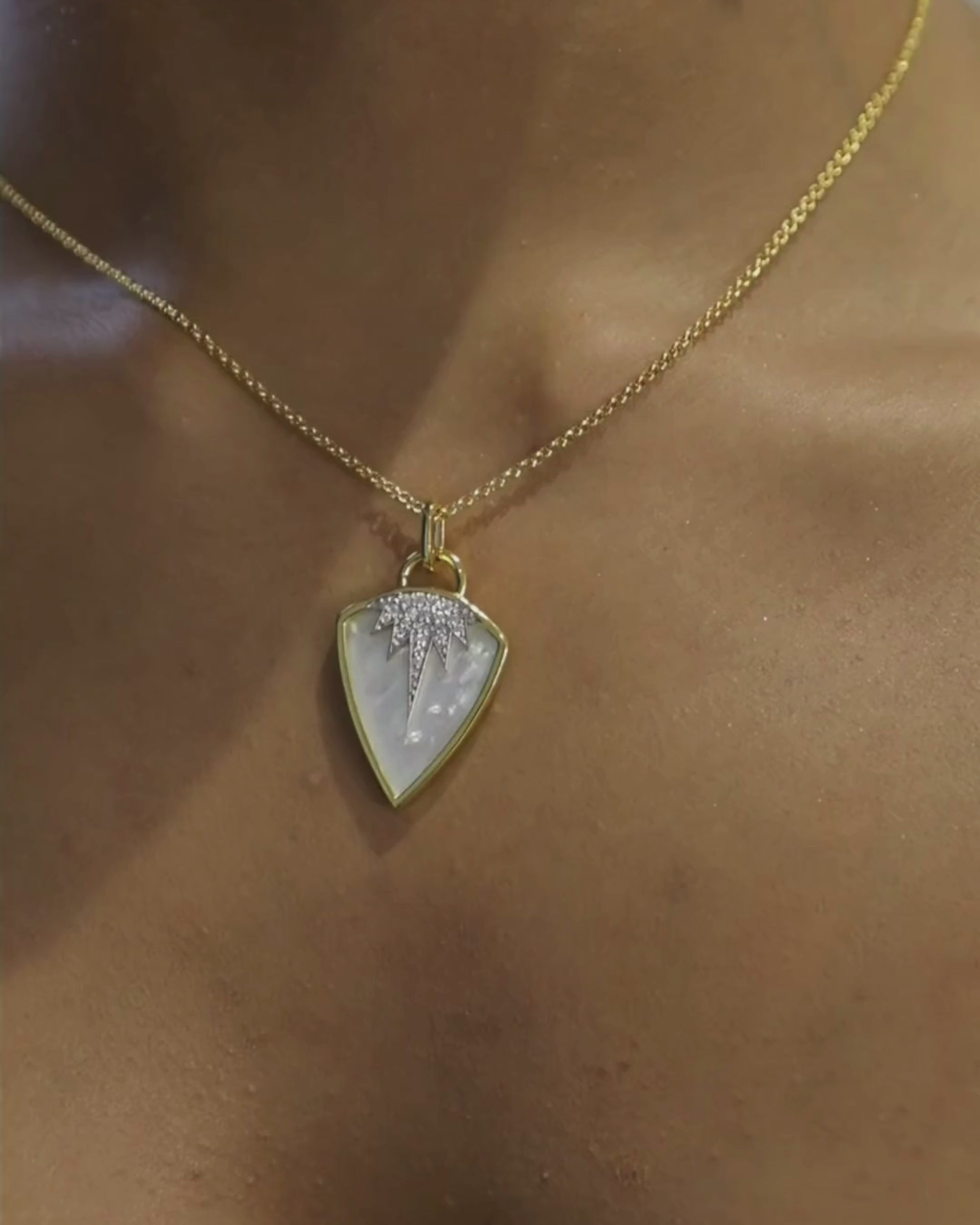 Our JUMANA shield pendant features a finely detailed crystal sunburst design with a smooth bezel surround, set with mother of pearl. Wear with our IVY Fine Chain for a simple look, or pair with our chunkier multiway chains for a bolder style.