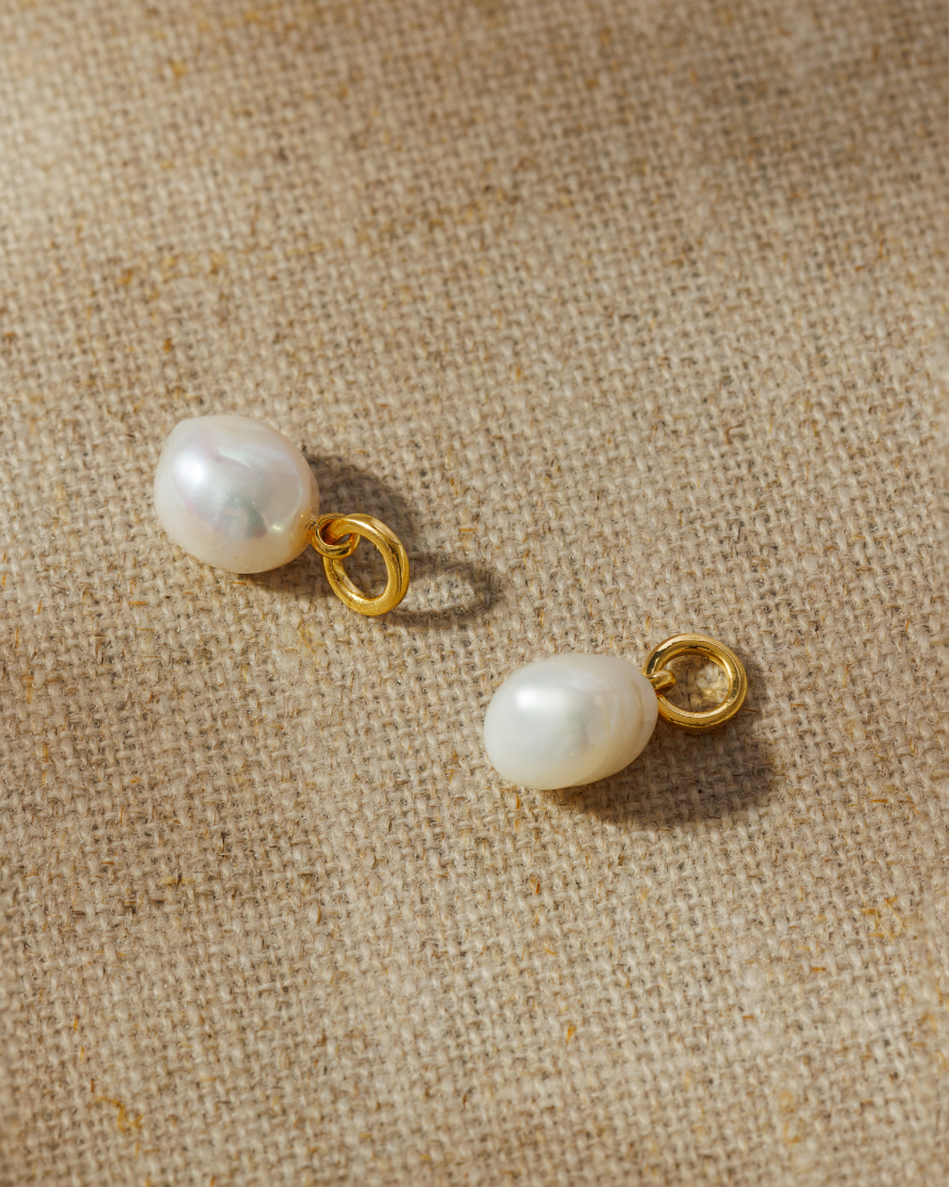One pair of pearl drop earring charms. Crafted from recycled 18ct gold-plated brass with freshwater pearls. Please note - the size and shape of the pearls may vary.