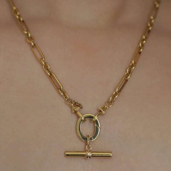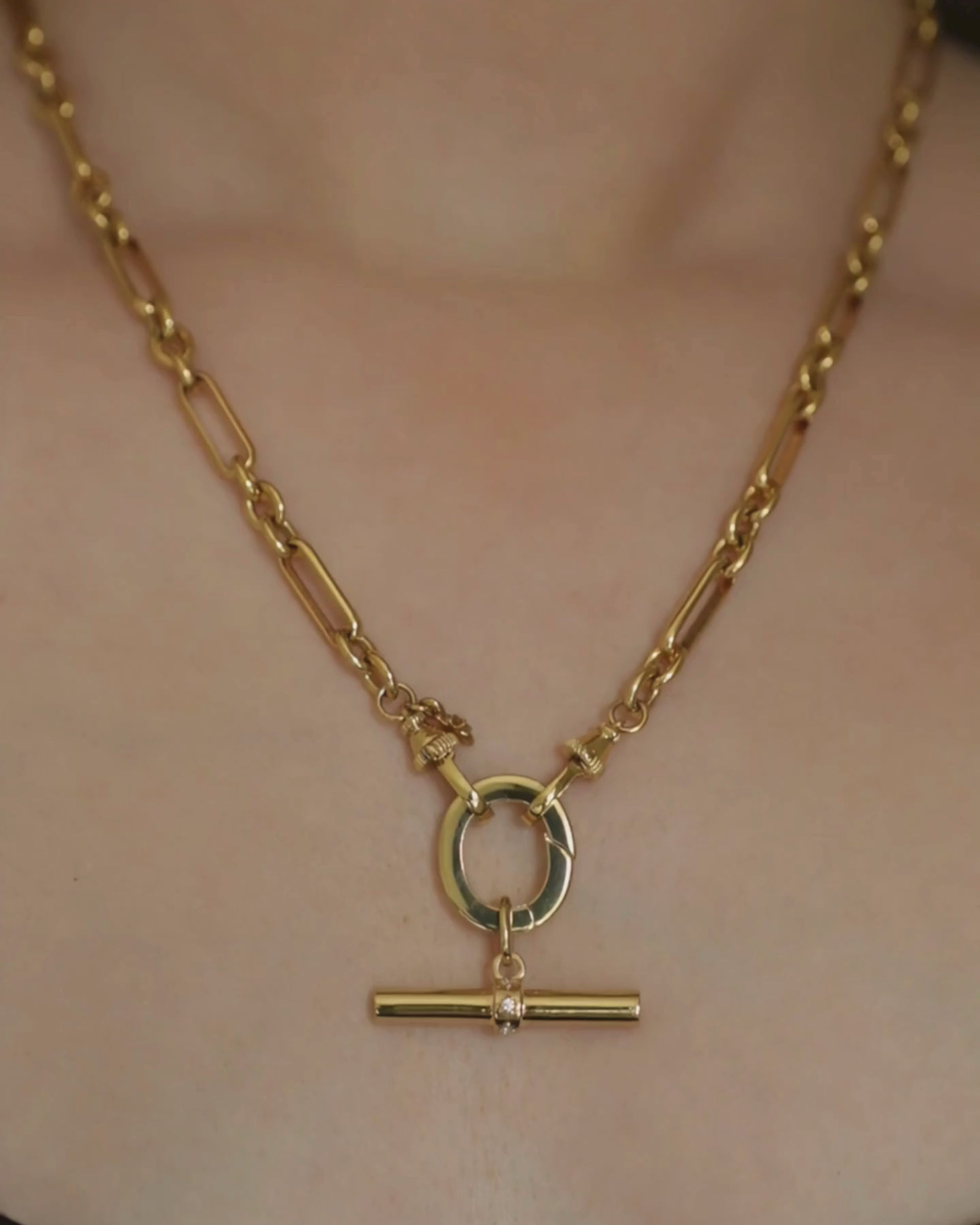 The TABITHA necklace is crafted in recycled 18ct gold-plated brass, finished with a smooth oval clasp that can be worn to the front, used to attach a pendant, or removed for a shorter fit. Together, they create an elevated everyday combination.