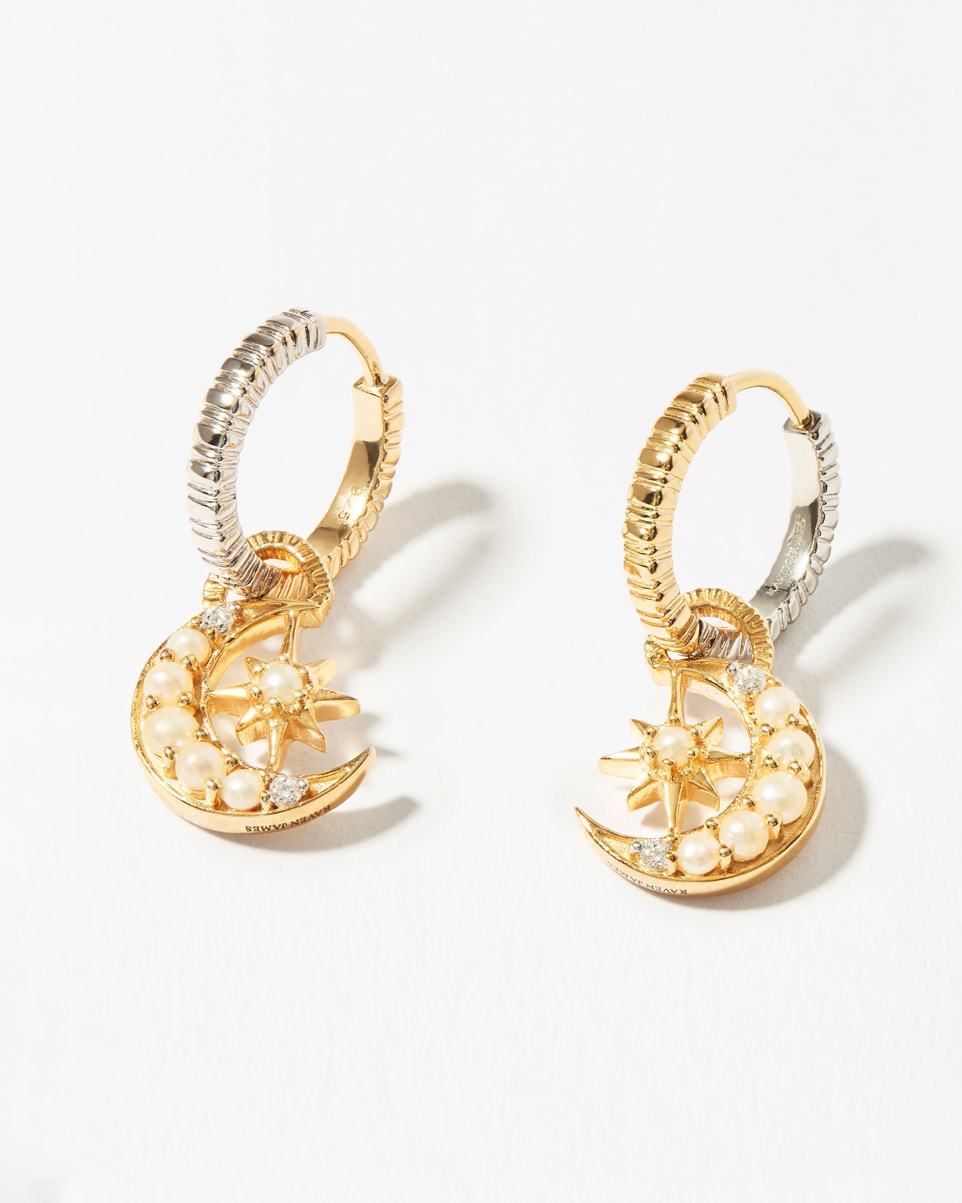 Hoops in solid, recycled, 925 sterling silver with gold vermeil and charms in 18ct recycled gold plated brass with round brilliant cut white crystals and cultured pearls