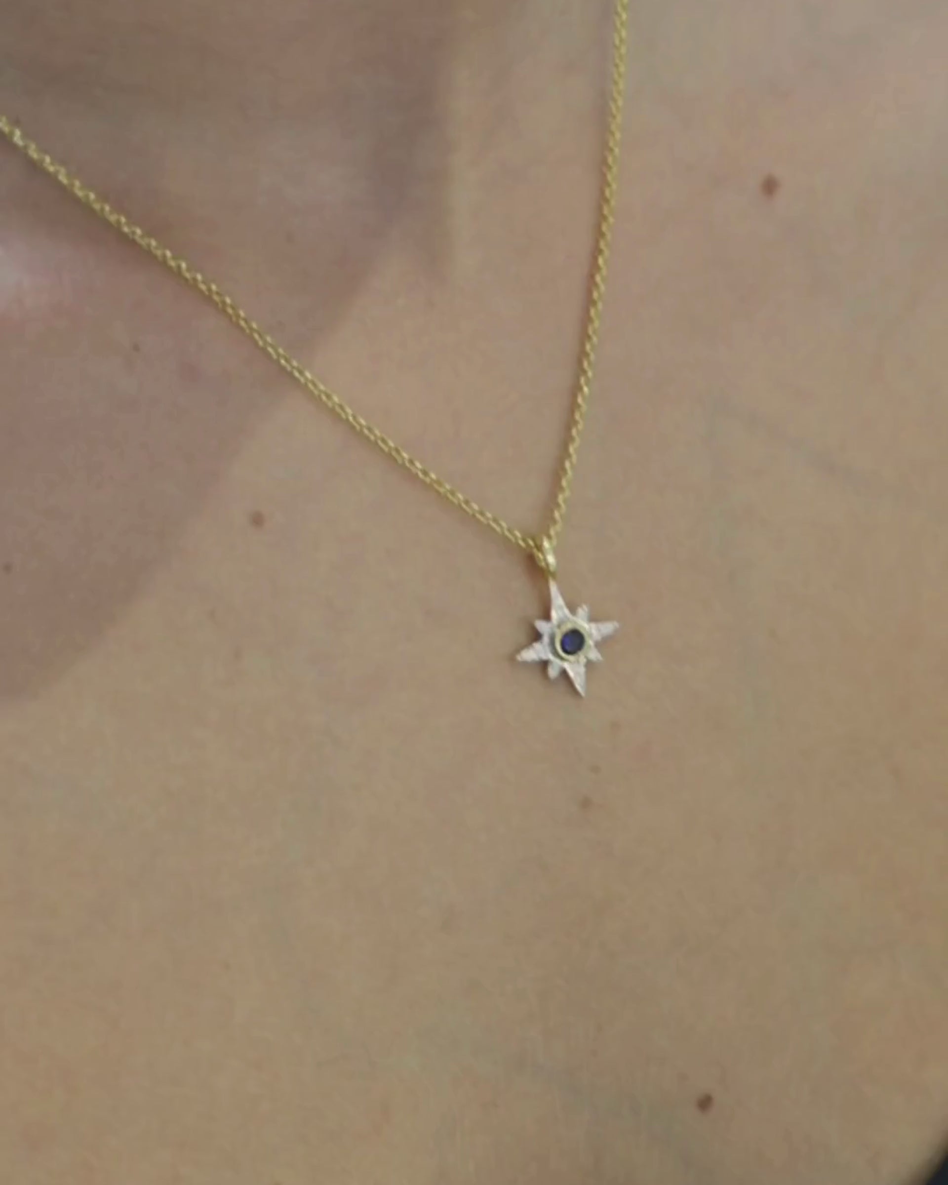 Our beautifully delicate NORTH STAR necklace is the perfect choice for an everyday statement. A single north star pendant strung on a delicate chain with a tiny, sapphire blue crystal.