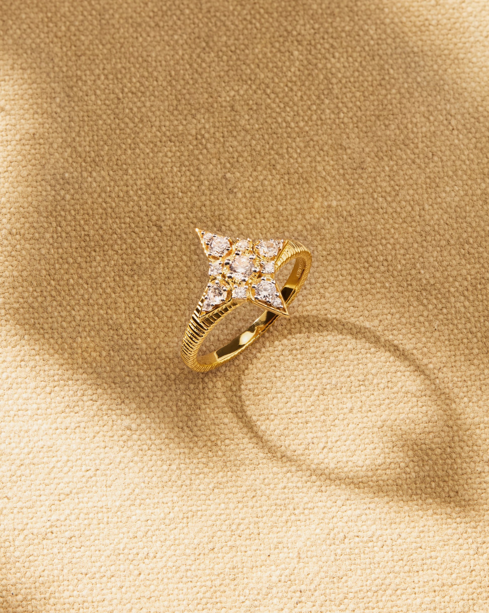 Our bestselling ring, NOVA is inspired by an original antique design, featuring a star of brilliant-cut crystals set on a coin-textured gold vermeil band.
