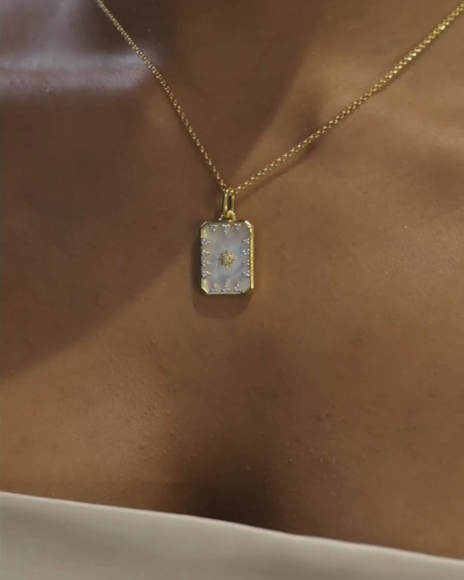 Our stunning OCTAVIA pendant in Mother of Pearl is studded with our signature north star design and edged with a delicate 18ct gold-plated bezel. Add it to any of our multiway chains, or string it on a simple gold IVY chain. Designed to be reversible - flip it around for a more pared back look.