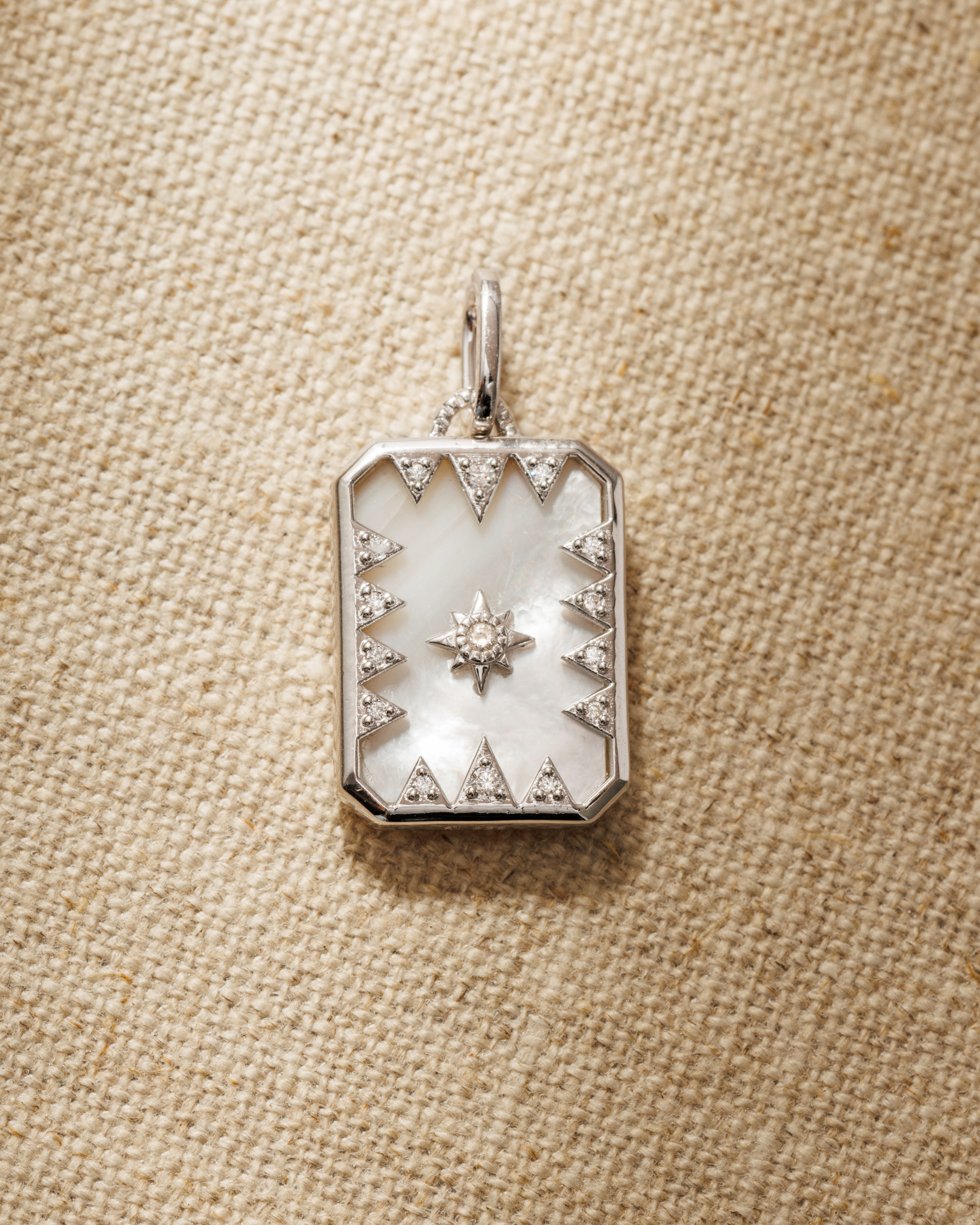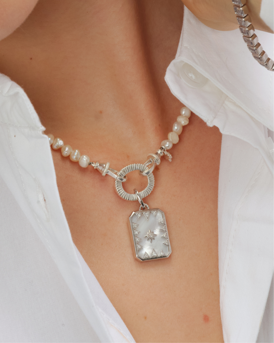Our bestselling OCTAVIA pendant now comes in solid silver. Features a Mother of Pearl backplate studded with our signature north star design and edged with a delicate silver bezel. Add it to any of our multiway chains, or string it on to one of our fine IVY chains. Designed to be reversible - flip it around for a more pared-back look.