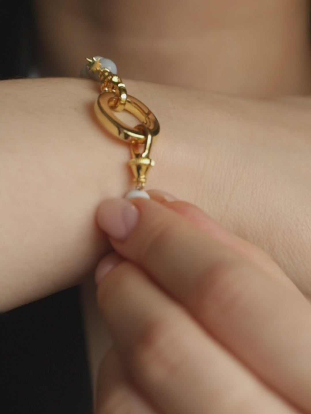 Our SIENNA Gemstone Beaded Bracelet features a single strand of Peru Blue Opal gemstone beads, each one naturally unique with soft variations in tone from milky white to gentle sky blue.