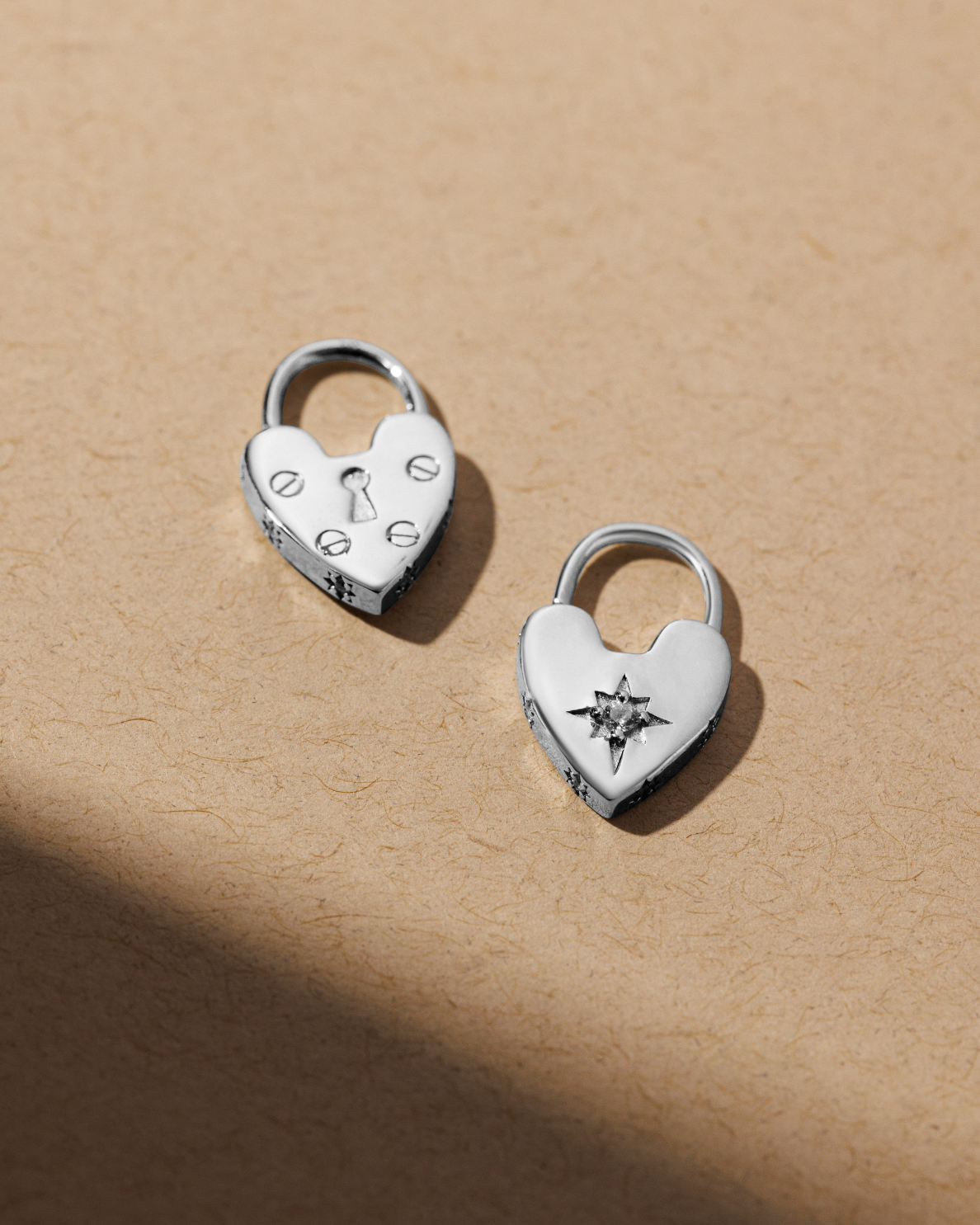 Our SUKI earrings, now in solid silver. The heart-lock design is inspired by victorian antiques, adapted for a more modern, versatile look. Crafted from recycled solid 925 sterling silver, the unique design is reversible and can be worn with the traditional lock design facing forward, or reversed to see the crystal detail of the tiny north star. The sides of the lock are also embelished with white crystals for extra detail.