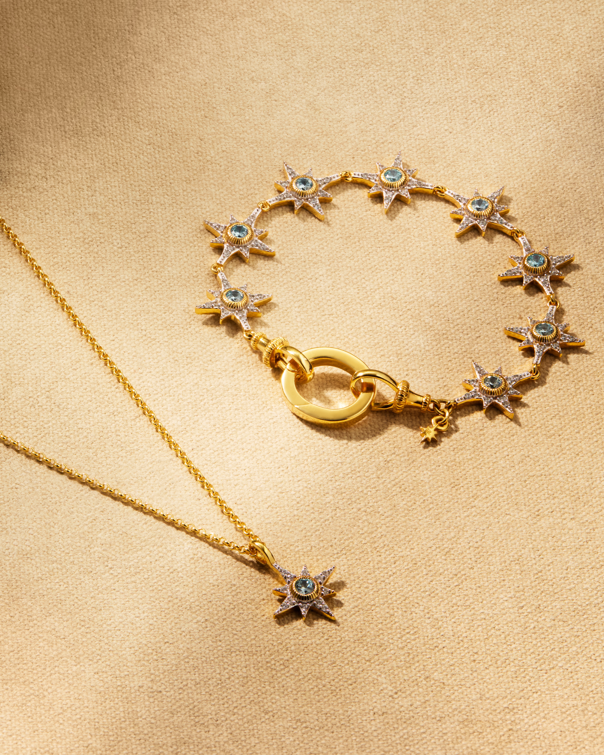 Our SUPERNOVA Aqua Set combines our SUPERNOVA bracelet and our North Star necklace, both in beautiful aquamarine blue.