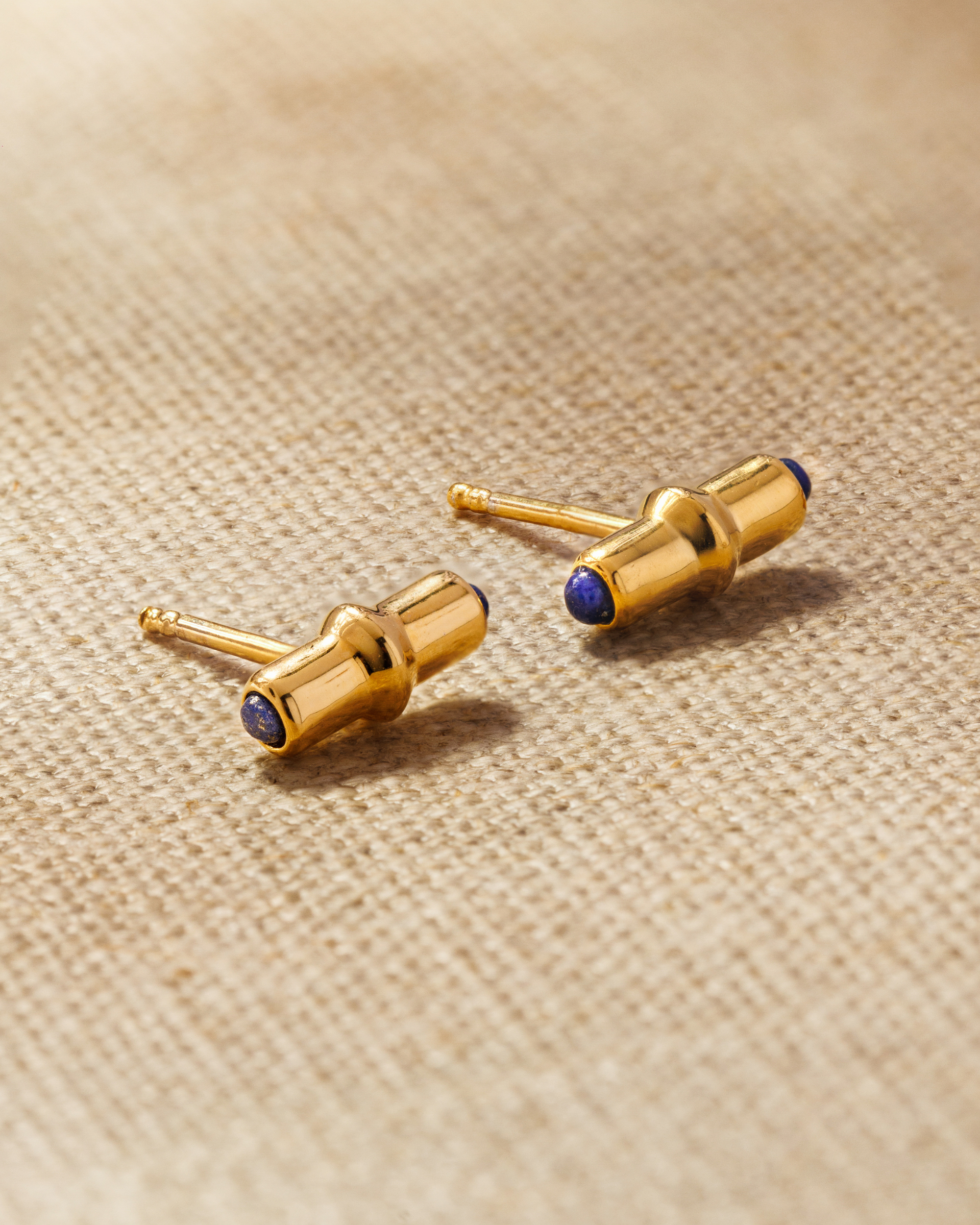 Our T-Bar studs in Lapis Lazuli pair a classic T-Bar design with striking deep blue, natural gemstone detailing on either side.