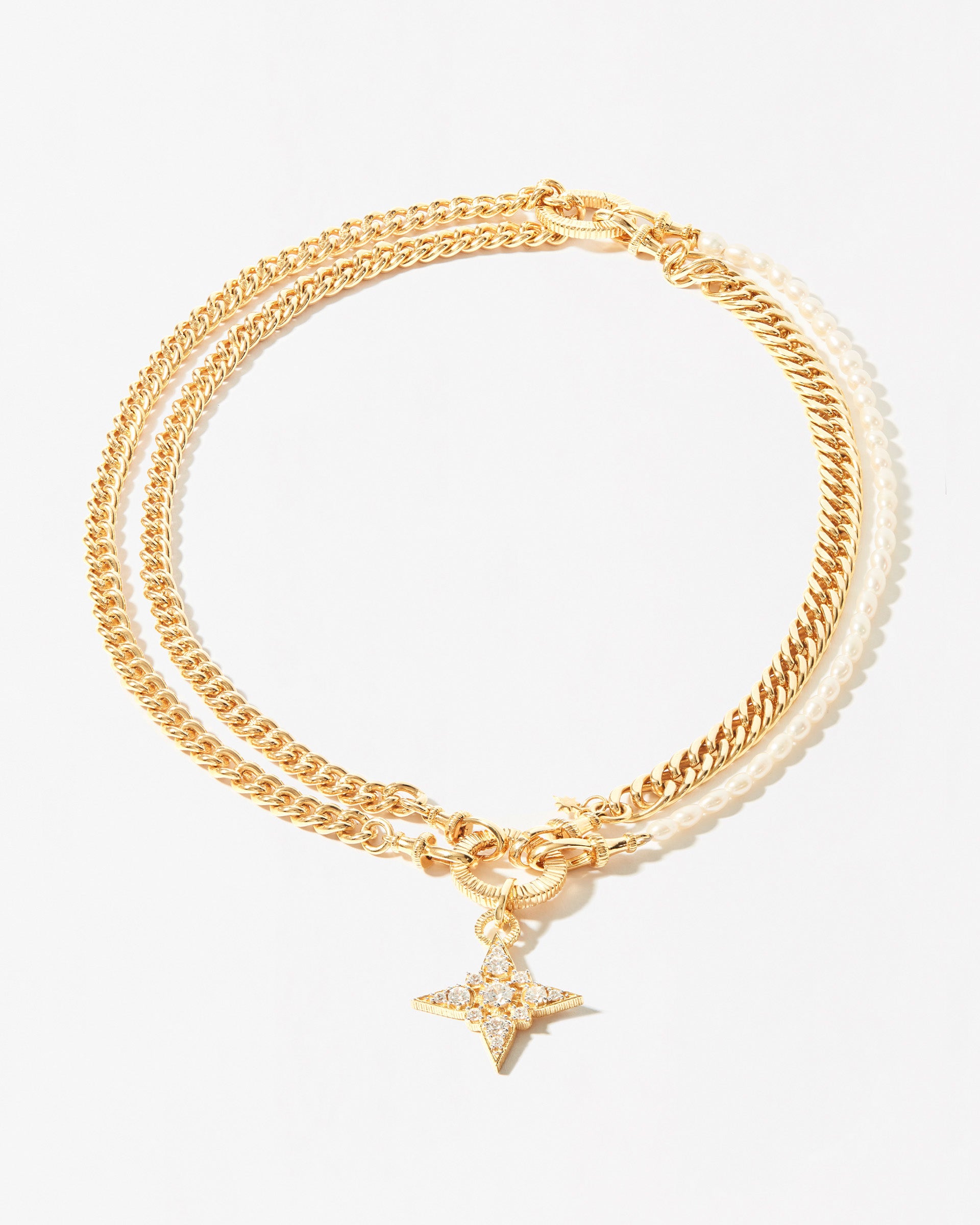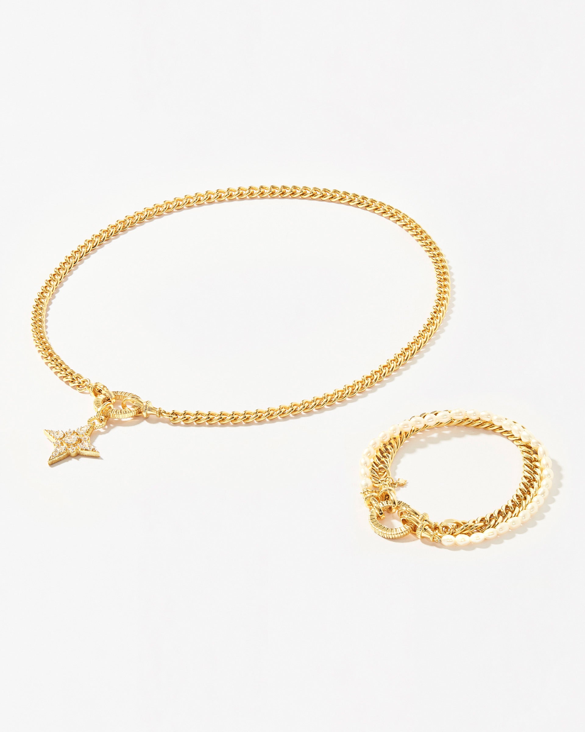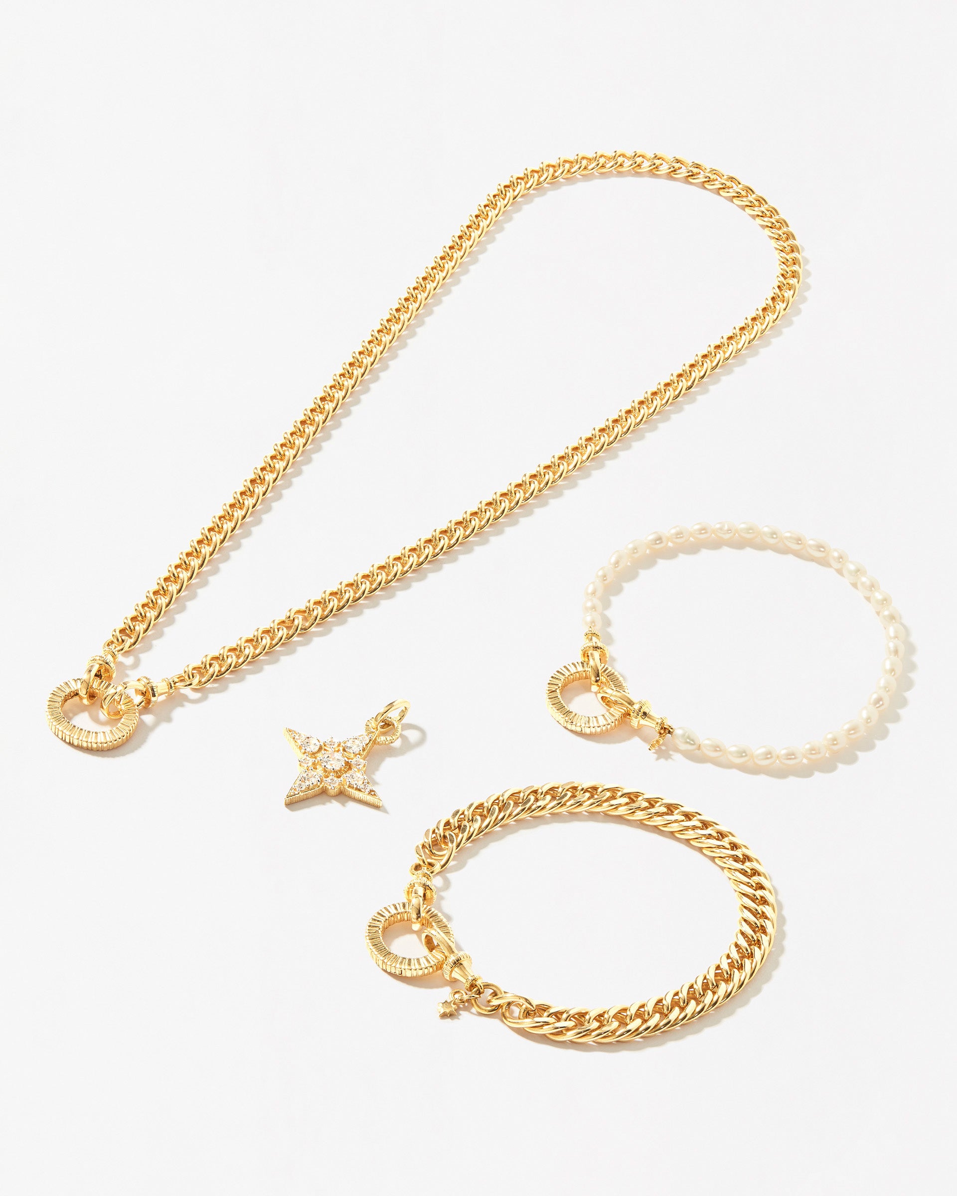 The ultimate jewellery combination: the DAWN chain necklace, DUSK chain bracelet, AERIN Pearl bracelet and the STELLA pendant. Wear the necklaces and bracelet alone, or link them together for a multi-layered effect. With its intricate antique-inspired design, the STELLA pendant can be added to the necklaces or the bracelet for added detail. How you choose to style your Multiway collection is up to you.